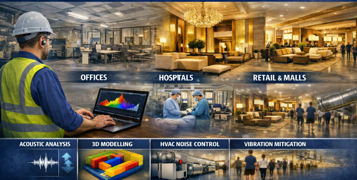 Thermosonics is a leading Building/ Commercial acoustic consultancy delivering advanced noise control and acoustic design solutions for modern commercial spaces. We help architects, builders, and facility owners create quieter, more comfortable environments through expert sound insulation design, room acoustics, HVAC noise control, and vibration mitigation. With precise acoustic analysis, simulation-based modelling, and industry-compliant engineering, Thermosonics ensures superior sound performance across offices, hotels, hospitals, malls, educational institutions, retail spaces, and mixed-use developments. We focus on comfort, clarity, and compliance—helping you enhance user experience while meeting national and international acoustic standards. If you’re looking for reliable acoustic consultancy for commercial projects, Thermosonics provides the right expertise to optimize your space.